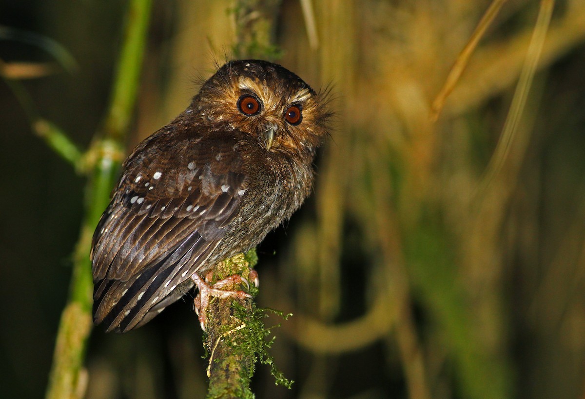 According to surveys conducted by Lane and Angulo, Long-whiskered Owlets occur from around 1,900 m to 2,600 m (6,200–8,500 feet) in the Abra Patricia and Colán mountain ranges in northern Peru. Previously the owlets were thought to occupy stunted forests, but Lane and Angulo found them in forests with trees less than 9 m (29 feet) tall and in taller forests up to 15 m (49 feet) tall both with and without bamboo in the understory. In these forests, Long-whiskered Owlets primarily eat insects but may eat small frogs or lizards on occasion.